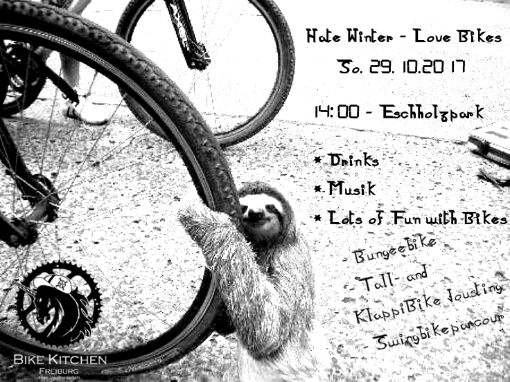 Es ist bald Winter, es ist bald kalt, deshalb geht die G19 bikekitchen in Winterpaus. Also kommt zum letzten Mal in diesem Jahr zum heiligen Tall-Bike! Und bekämpfe deine Freunde in einem heftigen Klappi-Turnier Bungee-bike und swing-bike Parkour ...und natürlich Bier trinken