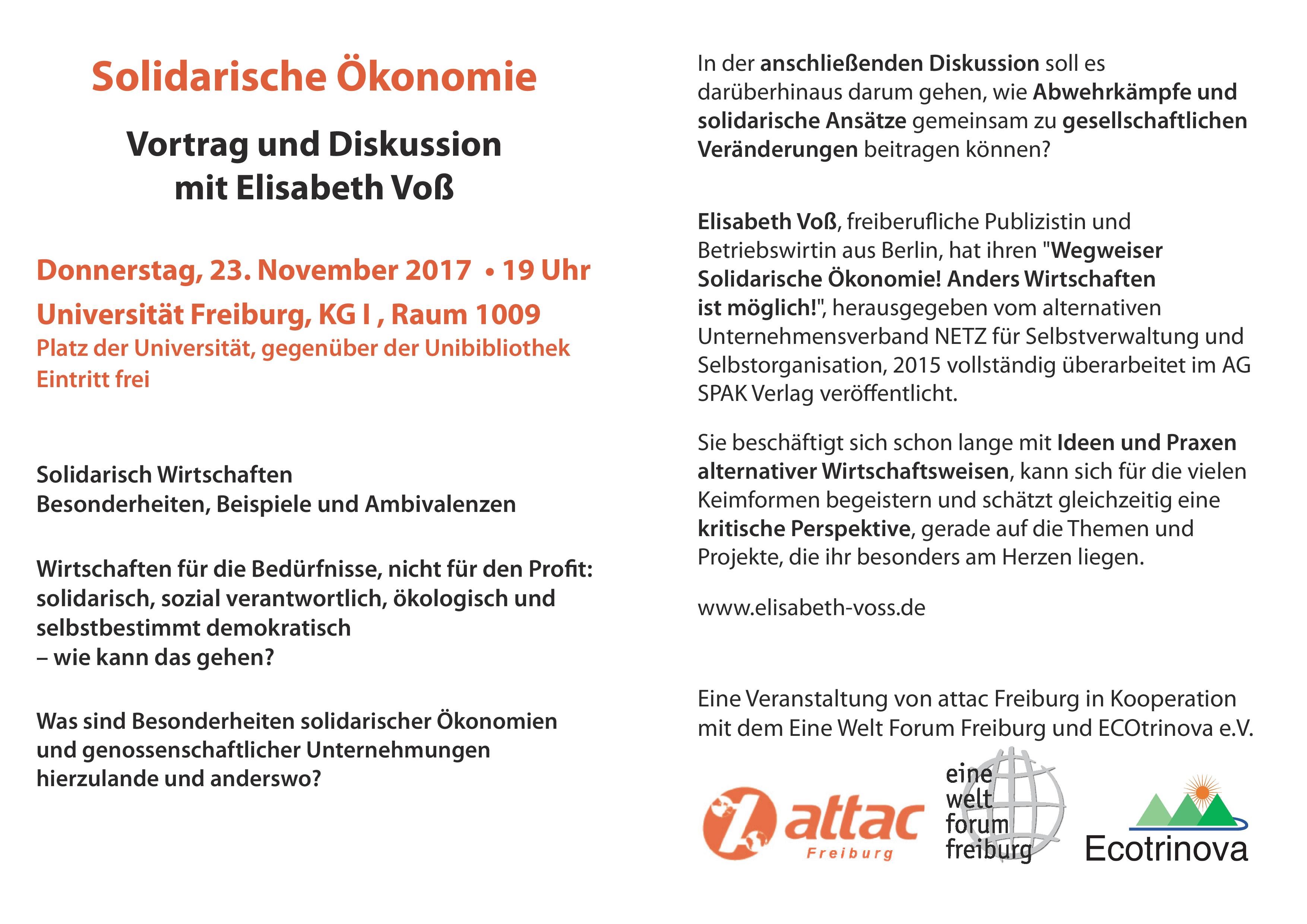 Elisabeth Voß, freiberufliche Publizistin und Betriebswirtin aus Berlin, hat ihren "Wegweiser Solidarische Ökonomie! Anders Wirtschaften ist möglich!", herausgegeben vom alternativen Unternehmensverband NETZ für Selbstverwaltung und Selbstorganisation, 2015 vollständig überarbeitet im AG