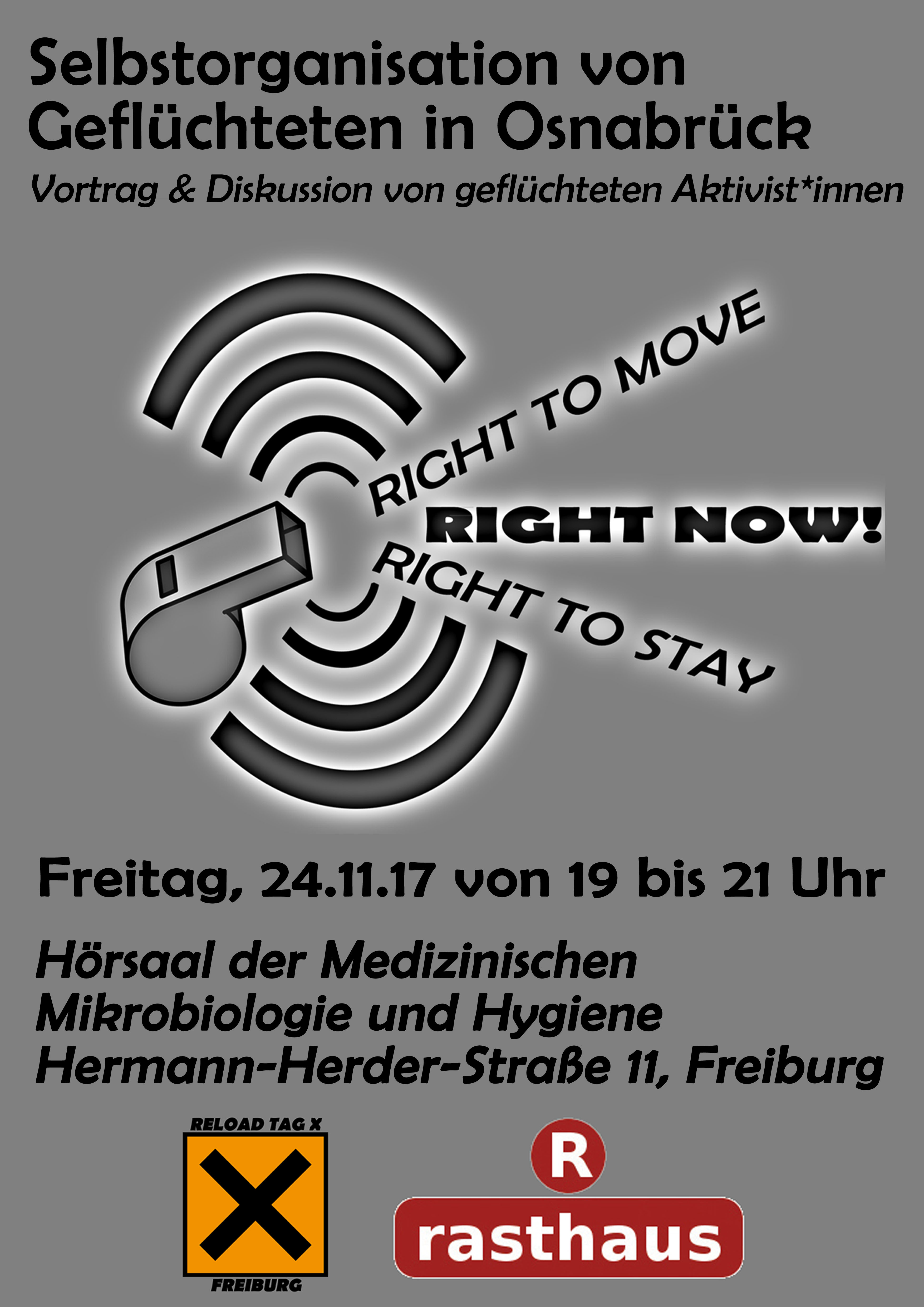 Geflüchtete Aktivist*innen aus Osnabrück berichten von erfolgreichen Abschiebeverhinderungen durch die Selbstorganisation unter Geflüchteten im Heim sowie von weiteren Formen des friedlichen Protests durch die Vernetzung unter Geflüchteten und mit solidarischen Unterstüzer*innen. Sie erklären, wie sie Grenzen der Isolation, Angst und Passivität überwinden und aktiv ihre Rechte einfordern.