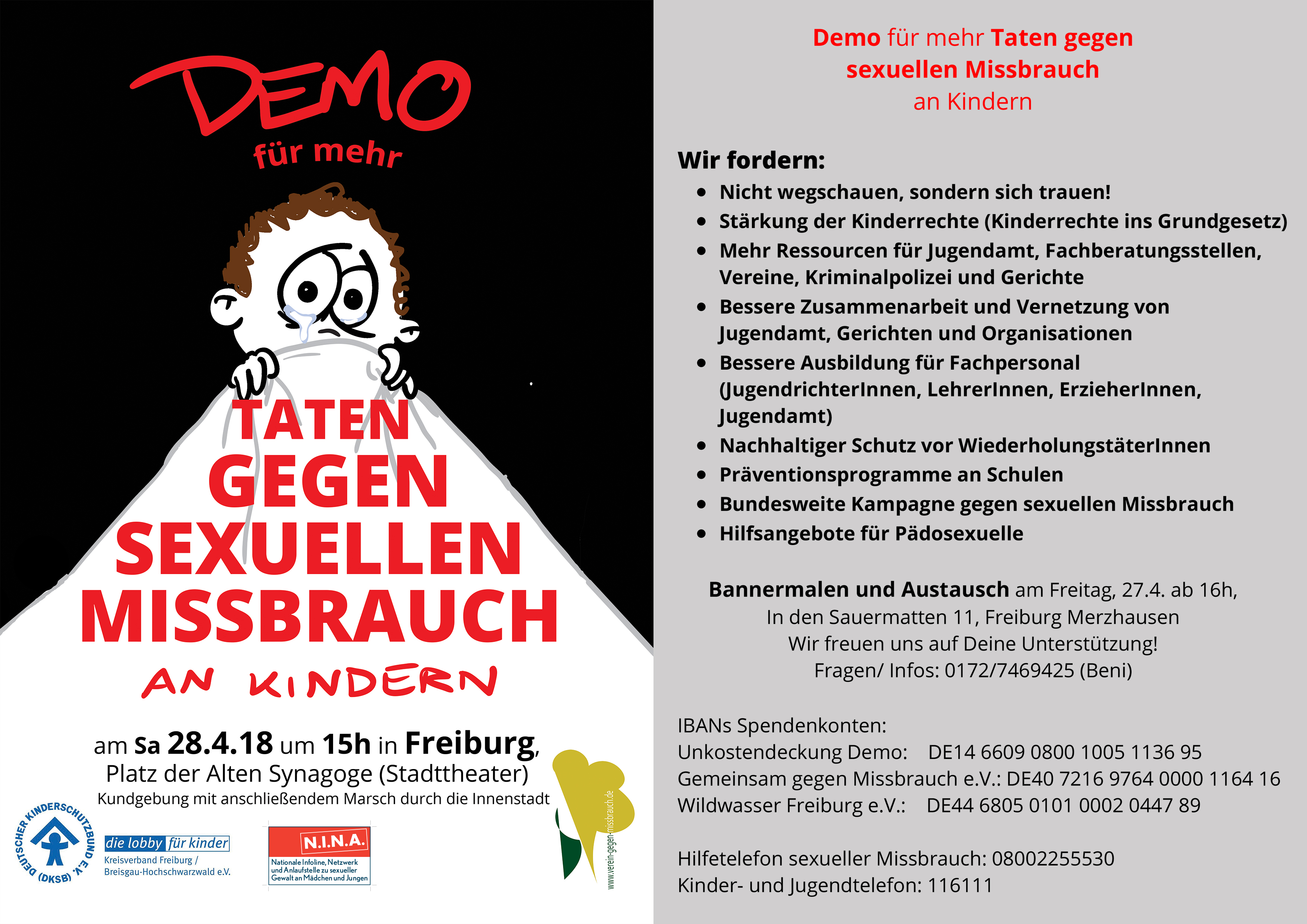 Samstag, 28.04.18 um 15:00 Uhr Platz der Alten Synagoge Platz der Alten Synagoge 79098 Freiburg im Breisgau Deutschland Show map Demo für mehr Taten gegen sexuellen Missbrauch an Kindern