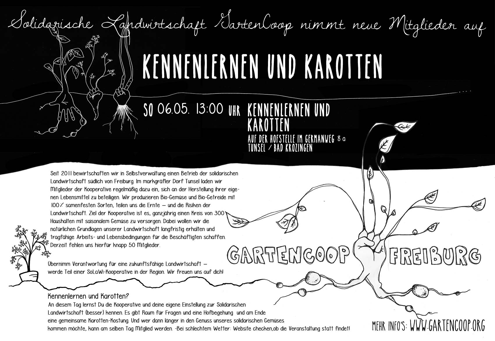Kennenlernen und Karotten? An diesem Tag lernst Du die Kooperative und deine eigene Einstellung zur Solidarischen Landwirtschaft (besser) kennen. Es gibt Raum für Fragen und eine Hofbegehung und am Ende eine gemeinsame Karotten-Kostung. Und wer dann länger in den Genuss unseres solidarischen Gemüses kommen möchte, kann am selben Tag Mitglied werden.
