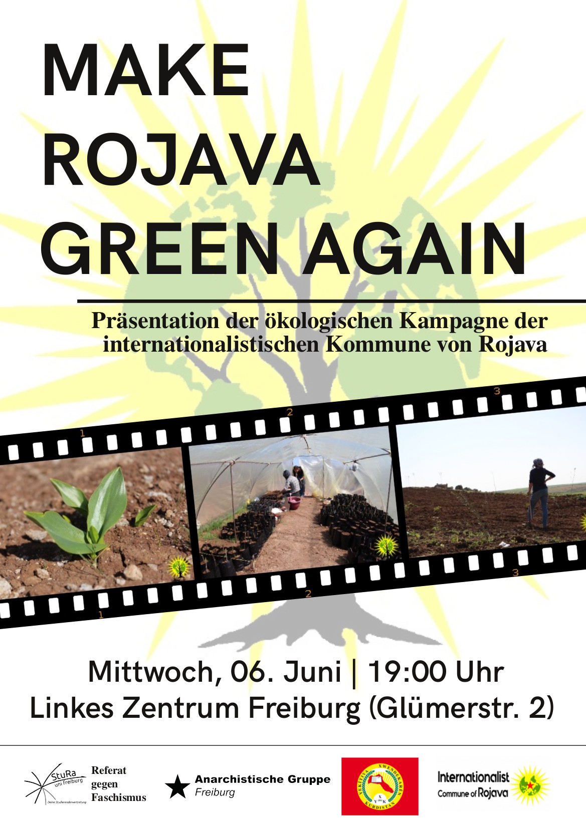 Neben dem Krieg ist die Zerstörung der Natur und damit der ökologischen Existenzgrundlagen der Menschen eines der größten Prolbeme in der Region. Wasserknappheit, Monokulturen, Luftverschmutzung und Entwaldung prägen weite Landstriche Nordsyriens. Kriege und Krisen werden in Toten und Verwundeten bemessen, die Zerstörung der Natur findet dagegen nur selten Beachtung. Mit der Kampagne “Make Rojava Green Again” versucht ein Zusammenschluss von Internationalist*innen, gemeinsam mit der Bevölkerung in Nordsyrien, die drängenden ökologischen Probleme anzugehen.