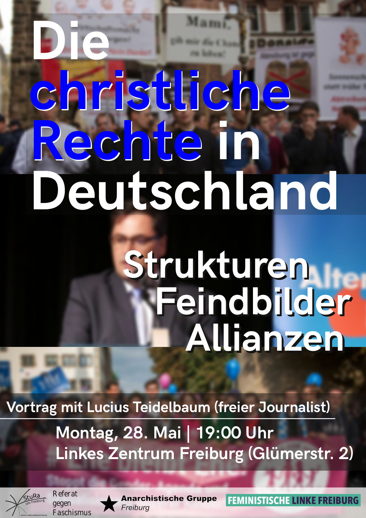 Doch das Wissen über deren Strukturen und deren Agenda ist häufig eher gering. Dazu kommen Fehleinschätzungen über Stärke und Einfluss der christlichen Rechten. Der Vortrag will eine realistische Einschätzung über Einfluss, Stärke und Kampagnenfähigkeit der christlichen Rechte in der Bundesrepublik geben. Er soll zudem auch eine Einführung in ihr Weltbild liefern. Die Schilderung des reaktionären Weltbildes der christlichen Rechte ist notwendig, um deren Positionen nachzuvollziehen.