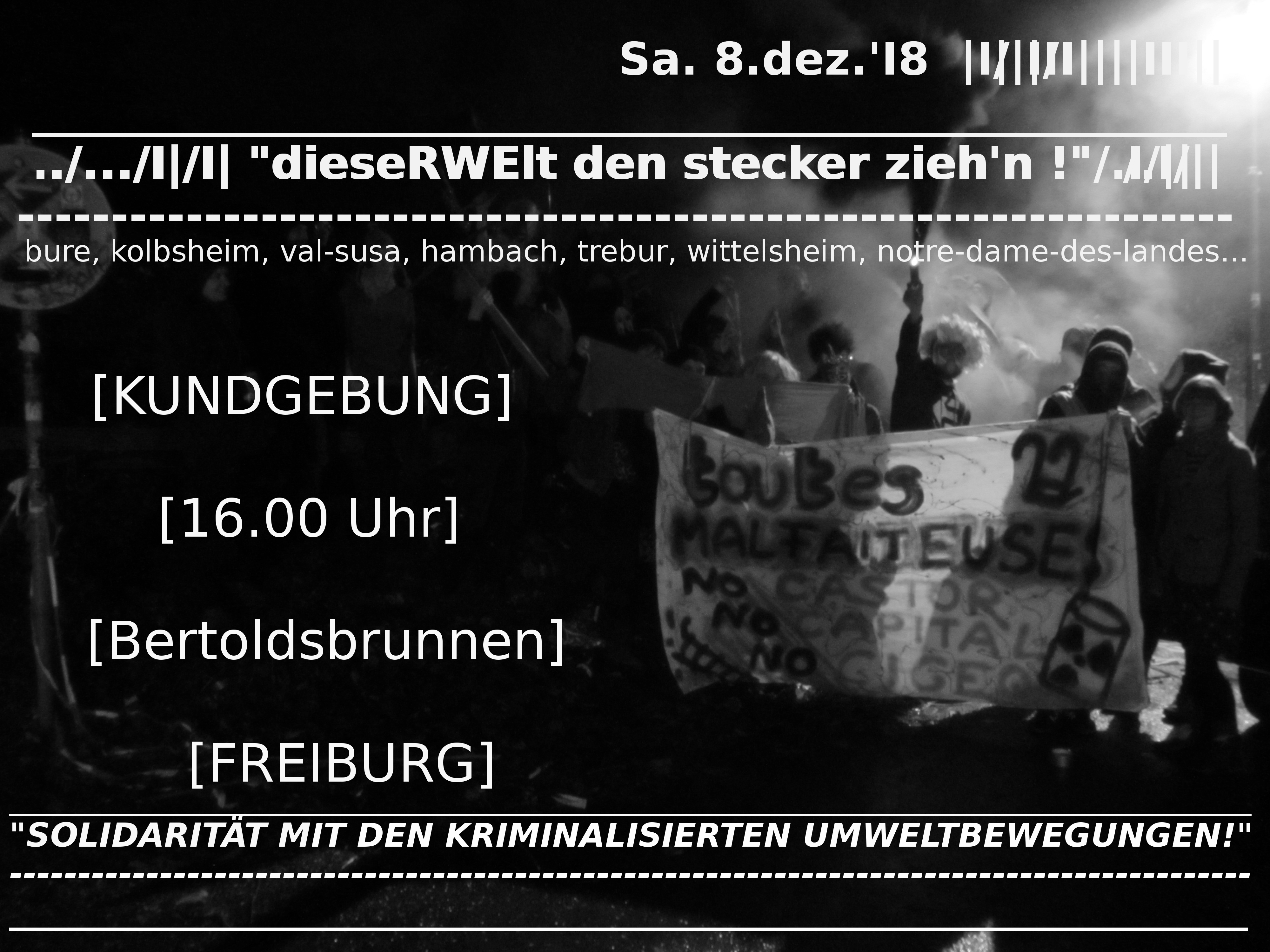Sei es in Fragen der globalen Ausbeutungsketten von Gold, Uran, Kohle, Öl oder Rohstoffen wie etwa Holz und Lebensmittel – die Transformation, die Verpackung und der Transport dieser Resourcen; es gilt dem kapitalistischen Größenwahnsinn entgegenzutreten. Vor unserer Haustür, etwa in Bure, in Strasbourg, im Susa-Tal, in Notre-Dame-des-Landes oder zuletzt in Hambach stossen unnütze Großbau- und Extraktivismus-Projekte des Kapitals auf erbitterten Widerstand. Immer wieder sind es private Sicherheitsfirmen, Nachrichtendienste, verschiedene Polizeien und in letzter Instanz das Militär, die die Interessen des Neoliberalismus auf Kosten kommender Generationen durchsetzten. AktivistInnen werden als Kriminelle verfolgt und bei Leib und Leben bedroht – auch wenn ihr Einsatz offensichtlich einer besseren Zukunft für alle dient.
