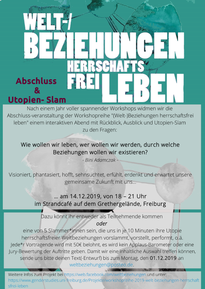 Nach einem Jahr voller spannender Workshops widmen wir die Abschluss-veranstaltung der Workshopreihe "(Welt-)Beziehungen herrschaftsfrei leben" einem interaktiven Abend mit Rückblick, Ausblick und Utopien-Slam zu den Fragen: