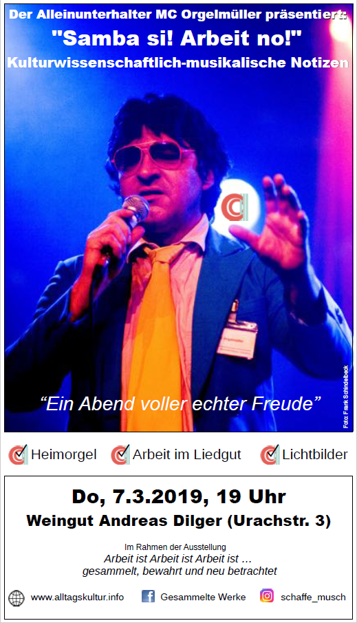 Seit langem beschäftigt sich der stets gut gekleidete Alleinunterhalter MC Orgelmüller (Ludwigshafen/St. Gallen) mit dem Thema Arbeit in der Musik. In einer eigens zusammengestellten Lecture Performance wird er dem Publikum mithilfe seiner modernen Heimorgel kulturwissenschaftlich-musikalische Notizen hierzu präsentieren: Das Arbeiter- und das sozialkritische Lied, der Protestsong und der Schlager sowie nicht zuletzt das Genre der Firmenhymne sind seine Quellen, die er durchforstet und befragt hat. Seine Spezialität sind darüber hinaus „Mitmachspiele“, die er in über 20 Jahren Berufserfahrung entwickelt hat. Seine Absichten legt er offen zu Tage, denn er sagt: „Ich möchte den Menschen an diesem Abend echte Freude bereiten!“