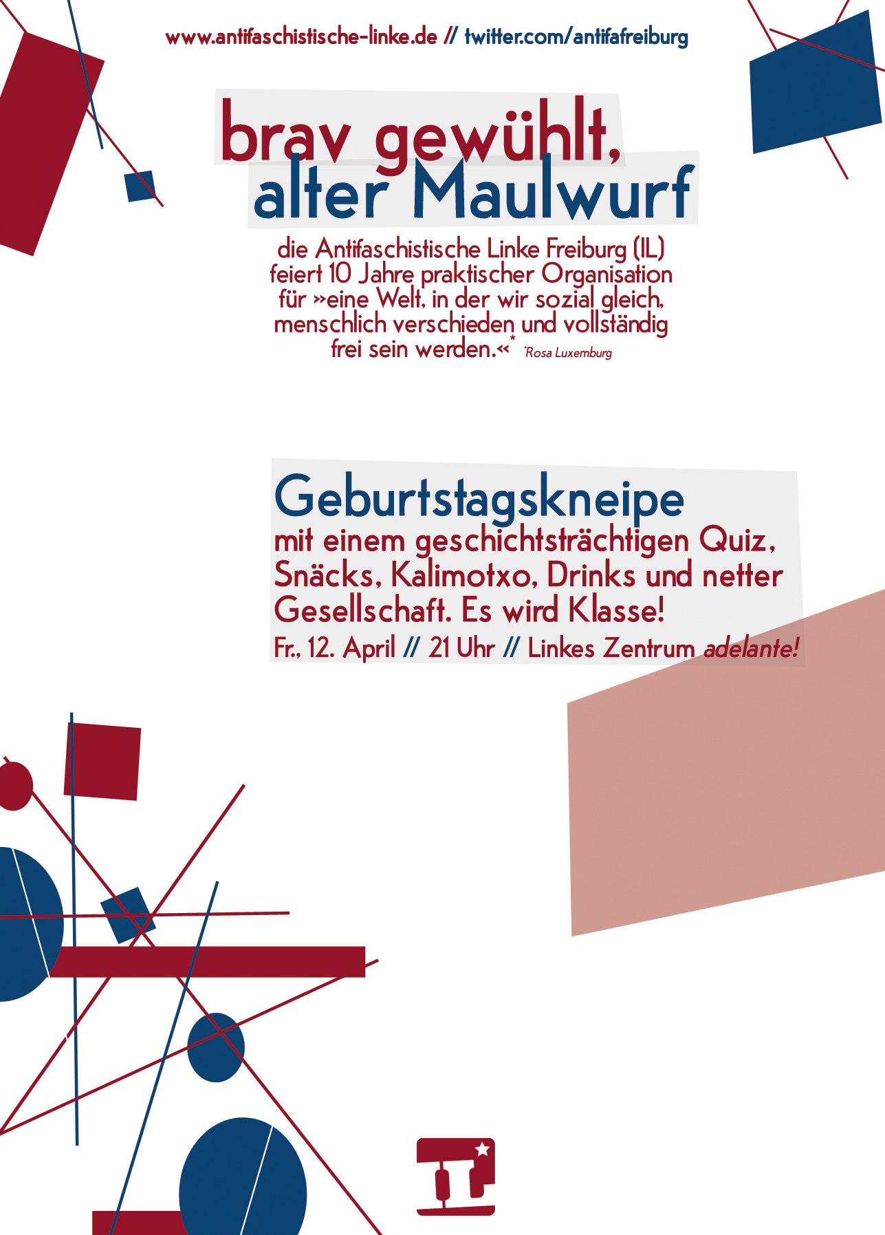 Die Antifaschistische Linke Freiburg (IL) feiert 10 Jahre praktische Organisierung für “eine Welt, in der wir sozial gleich, menschlich verschieden und vollständig frei sein werden.” – (Rosa Luxemburg)