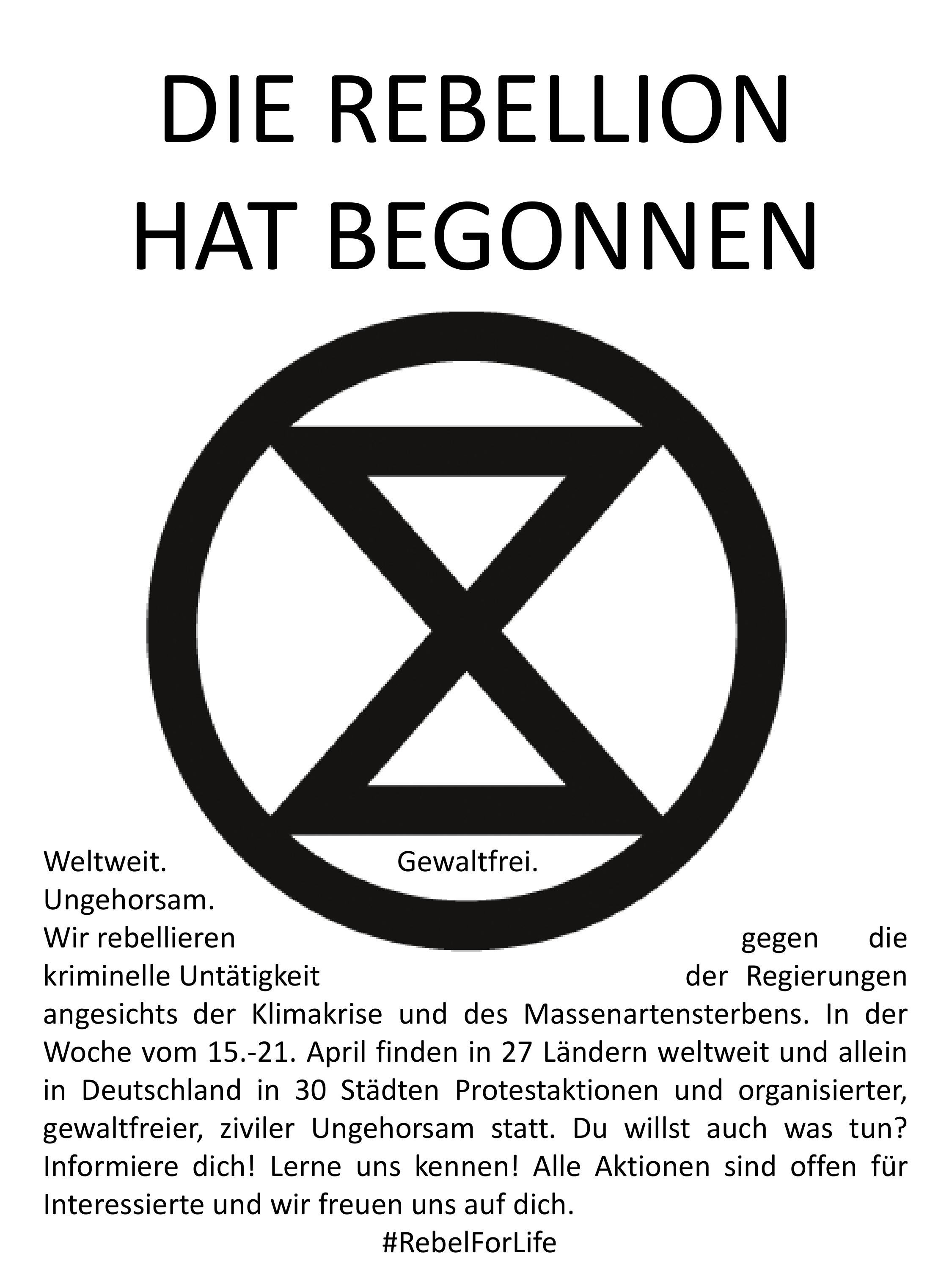 Extremwetterverhältnisse, Dürreperioden, schlechte Ernten, die bereits jetzt viele Menschen zur Flucht zwingen, massenhaftes Aussterben vieler Arten und die langsam steigende Temperatur auf unserem Planeten sind Gründe genug, um anzuerkennen, dass wir JETZT handeln müssen! Ein sofortiger Kurswechsel in der Politik ist nötig, um den Klimakollaps zu verhindern. Im Angesicht der Krise müssen wir uns weltweit vernetzen, zusammen aufstehen und rebellieren, um einen Systemwandel anzustoßen! Als Höhepunkt der internationalen Rebellionswoche zeigt Extinction Rebellion in ganz Deutschland auf: Wir werden nicht verstummen solange unser Planet und damit unsere Lebensgrundlage noch zu retten ist! Die Rebellion Week ist nur ein Vorgeschmack auf die Proteste die folgen werden!