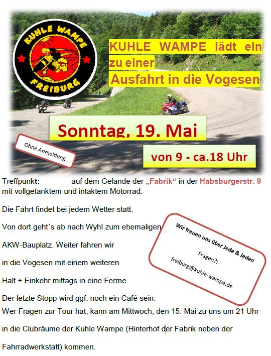 Wer Fragen zur Tour hat, kann am Mittwoch, den 15. Mai zu uns um 21 Uhr in die Clubräume der Kuhle Wampe (Hinterhof der Fabrik neben der Fahrradwerkstatt) kommen.