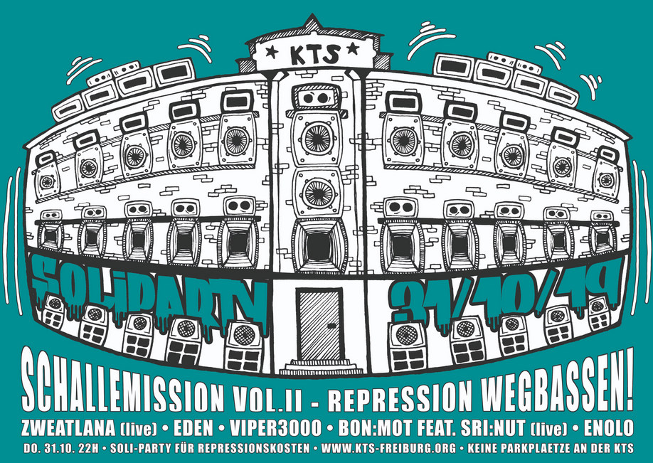 Die Einnahmen des Abends sollen die Antirepressionskassen füllen, damit Menschen die zum Beispiel wegen Protesten beim Piusbrüder-und AFD-Aufmarsch oder den No-Border-Actionsdays saftige Strafen zahlen müssen, solidarisch unterstützt werden können. Ein Teil des Geldes soll auch in die Arbeit des Ermittlungsausschuss Freiburg (EA) fließen, der Menschen bei Stress mit den Repressionsbehörden solidarisch unterstützt.