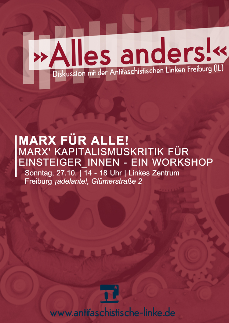 »Alles anders!« ist ein offener Gesprächsabend mit der Antifaschistischen Linken Freiburg (IL). In entspannter Atmosphäre wollen wir uns über aktuelle politische Themen, Strategien und Handlungsalternativen austauschen. Dabei steht jeder Abend unter einem thematischen Schwerpunkt – vom Aufstieg der AfD über Klimakämpfe bis hin zur Frage, warum wir noch immer im Kapitalismus leben. Egal, ob ihr nur reinschnuppern, einen geselligen Abend verbringen oder mitdiskutieren wollt – jede_r ist herzlich willkommen. Wir freuen uns auf euch!