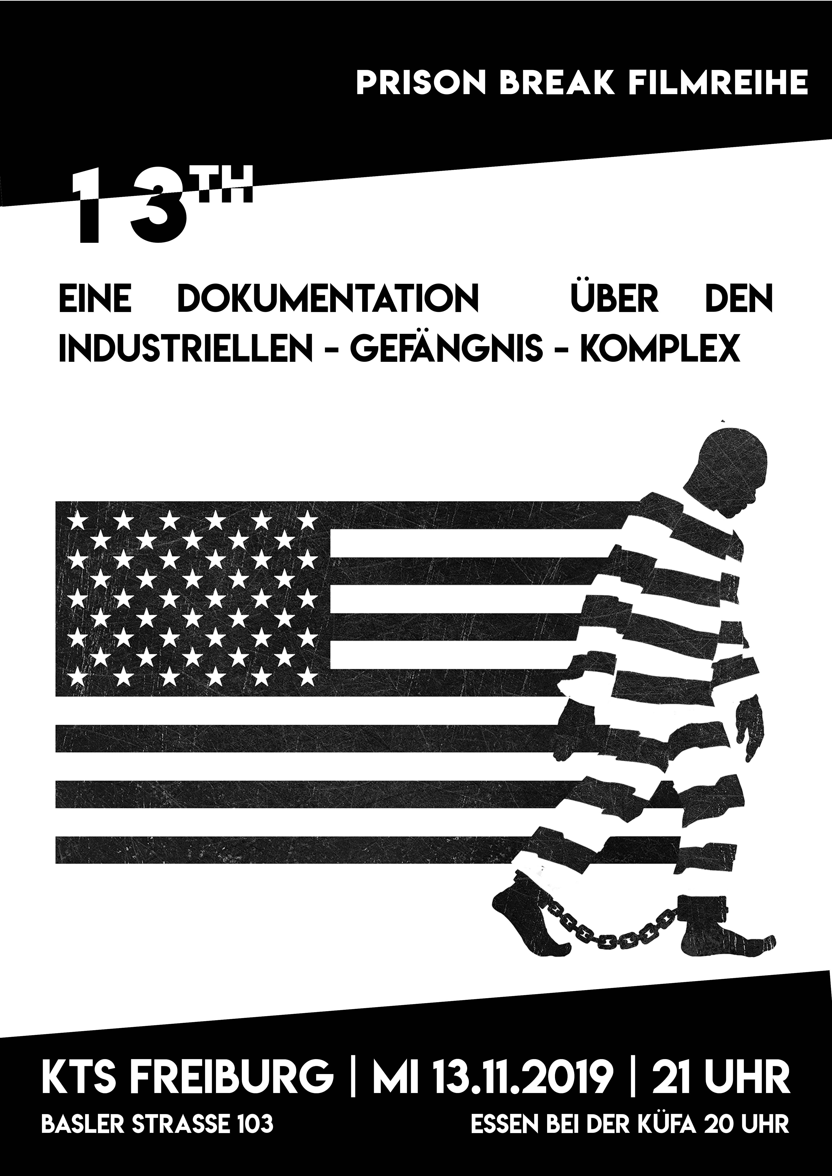 Wir zeigen die Anti-Knast Dokumentation 13th. Die Doku wird die erste in der Filmreihe "Prison Break" sein. Der Film beschäftigt sich kritisch mit dem US-amerikanischen Gefängnis-Industriellen-Komplex und der rassistischen Kriminalisierung seit der sogenannten Abschaffung der Sklaverei. Er zeigt dabei die institutionalisierten Rassismen die die heutige Gesellschaft durchziehen und wie daraus systematisch wirtschaftlicher Profit geschlagen wird.