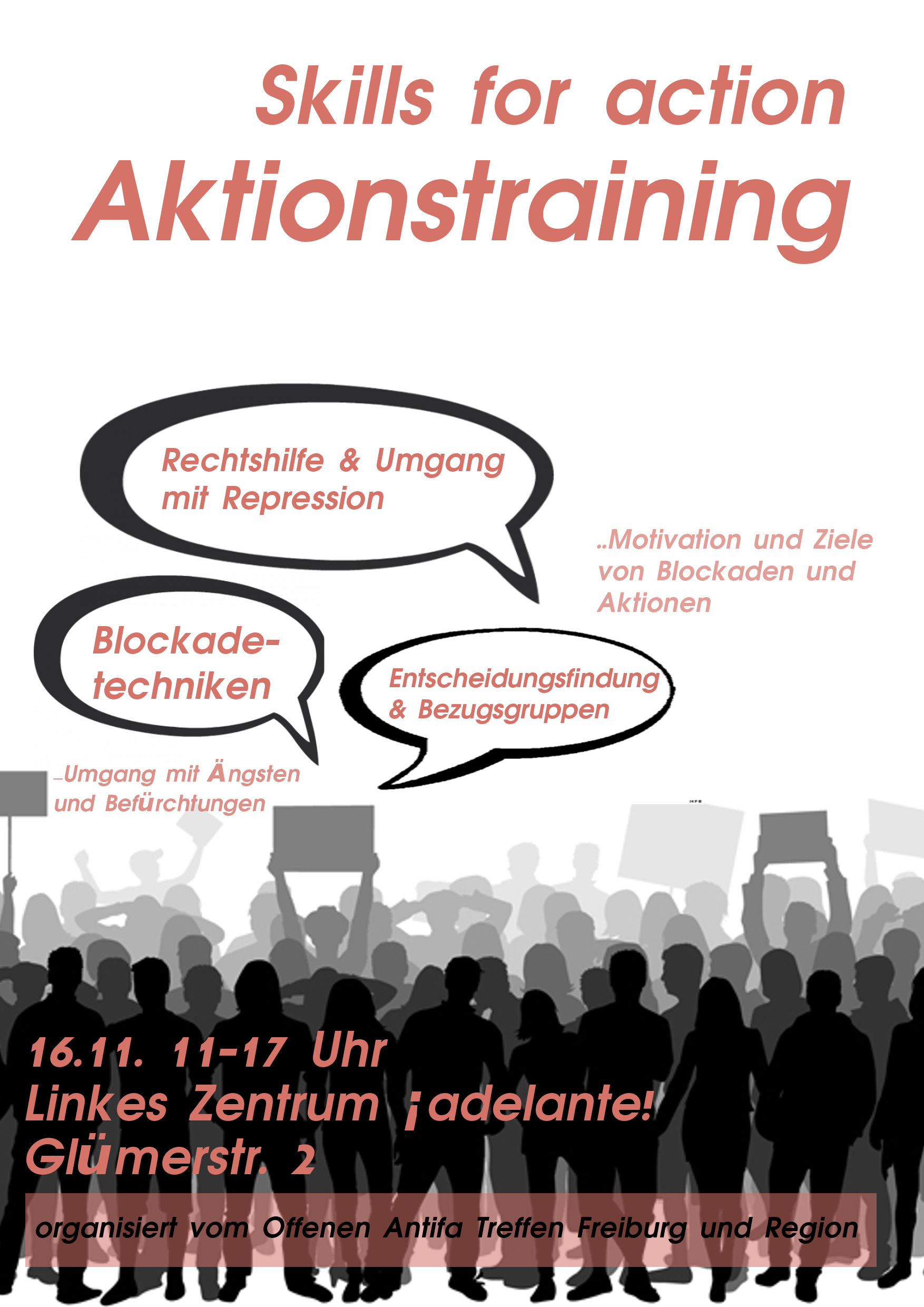 Zusammen mit erfahrenen Trainer*innen von Skills for Action – einem Netzwerk bewegungsorientierter Aktionstrainer*innen – veranstalten wir vom Offenen Antifa Treffen Freiburg am 16.11. von 11-17 Uhr im Linken Zentrum ¡adelante! ein Aktionstraining.