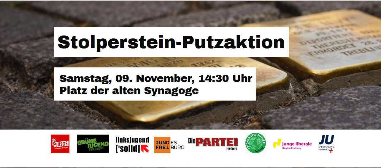 Um dem Schicksal der ermordeten jüdischen Menschen zu gedenken, laden Jusos, Junge Liberale, ’solid, Junge Union, Grüne Jugend, Junges Freiburg, Fridays for Future Freiburg und Die PARTEI am Samstag, den 9. November, dazu ein in einer gemeinsamen Aktion Stolpersteine in Freiburg zu putzen.