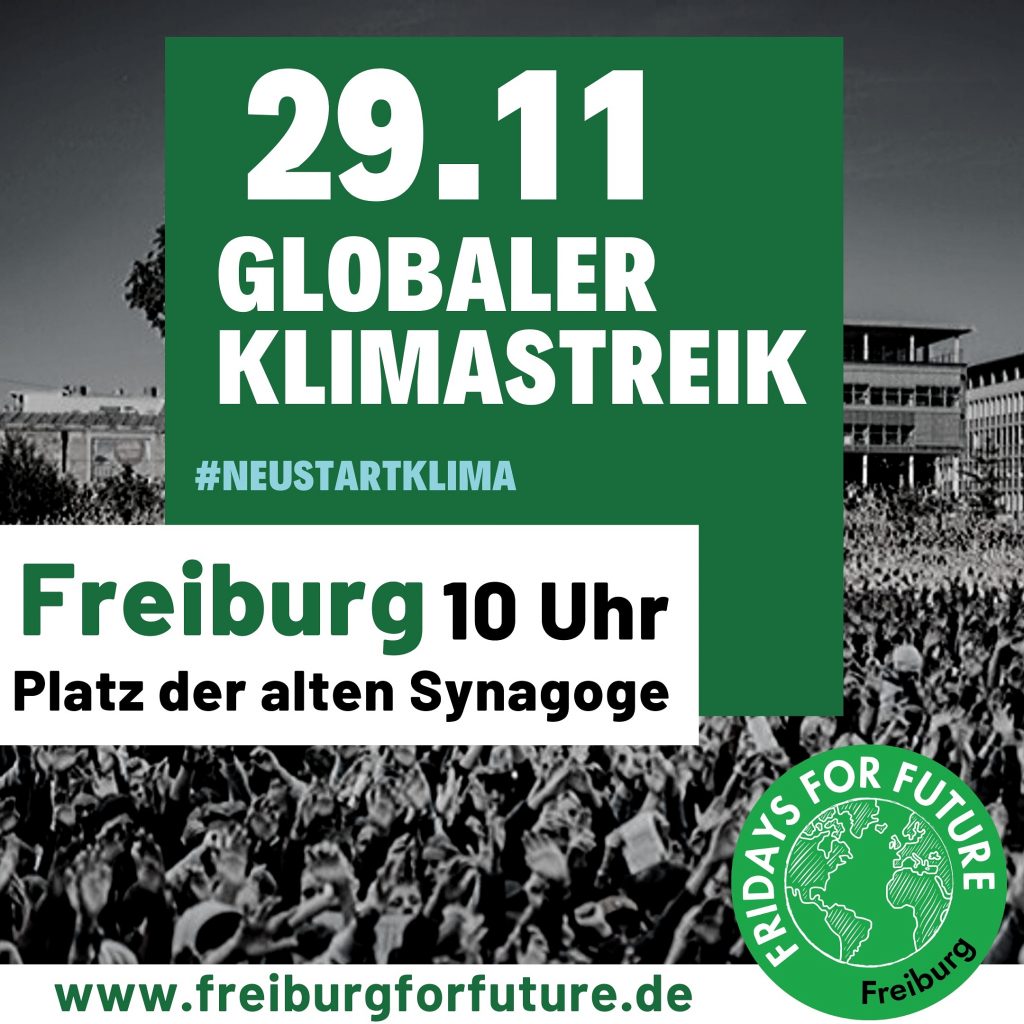 Freitag, 29.11.19 um 10:00 Uhr Platz der Alten Synagoge Platz der Alten Synagoge 79098 Freiburg im Breisgau Deutschland Show map Themen Ökologie Type of Event Demonstration Organization Fridays for Future