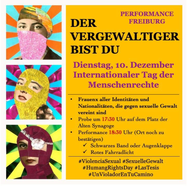 Performance und Protest am Dienstag, den 10.12.2019 – dem Internationalen Tag der Menschenrechte 17.30 Uhr Treffpunkt zur Probe am Platz der Alten Synagoge 18.30 Uhr Performance, Ort wird noch bekanntgegeben.