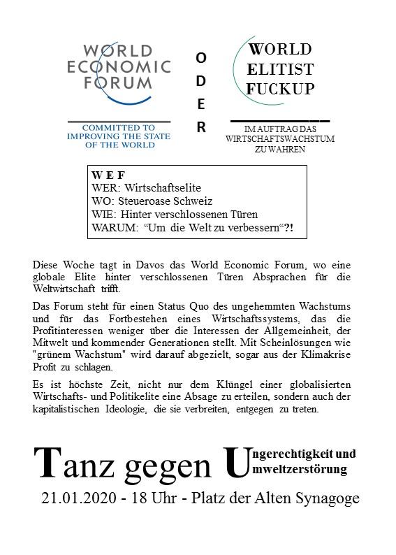 Mit Tanz und Redebeiträgen wollen wir klarmachen: Das Elitentreffen in Davos ist nicht die Lösung, sondern Teil des Problems. Der Klimakrise kann nur von unten begegnet werden.