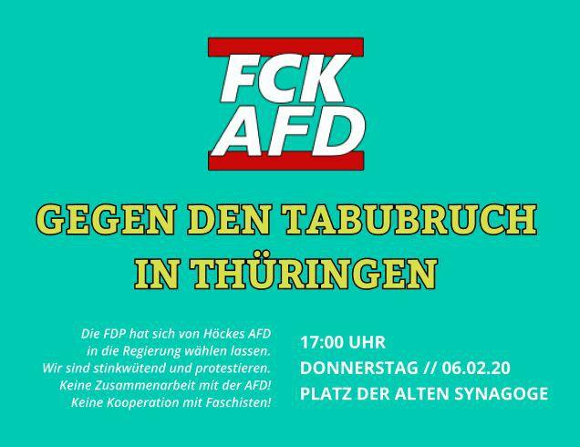In Thürungen hat sich Thomas Kemmerich der 5%-Partei FDP mit der Hilfe der AfD und der CDU zum Ministerpräsidenten wählen lassen und somit den antifaschistischen Grundkonsens mit Füßen getreten.