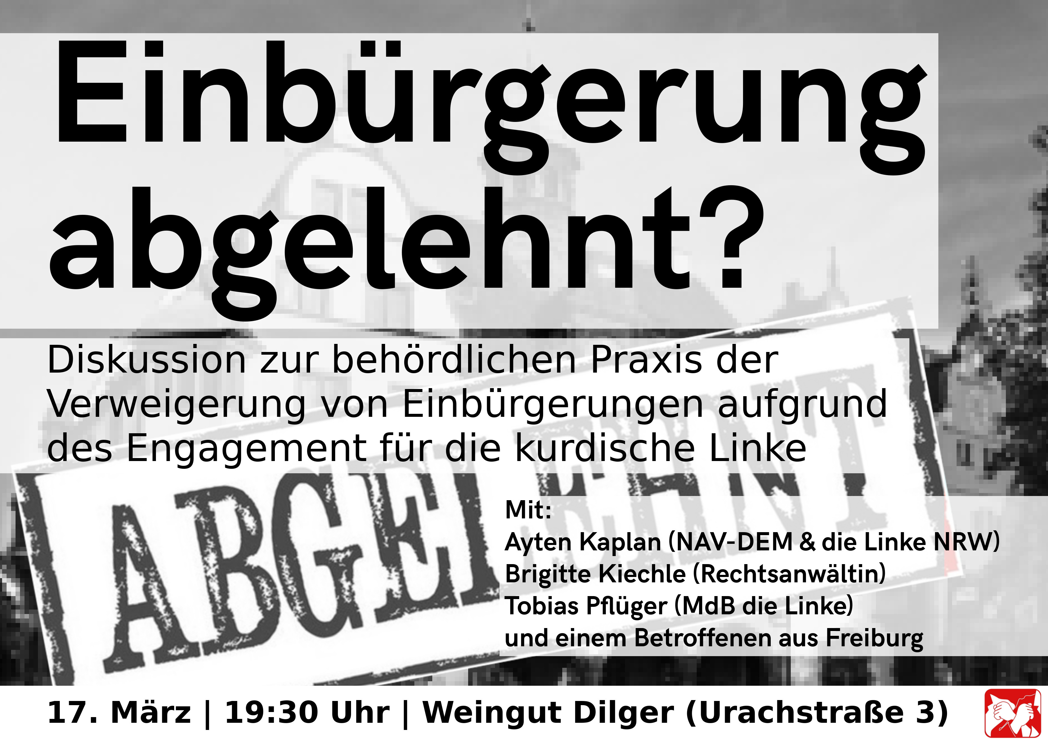 Wir wollen auf der Veranstaltung über die behördliche Praxis der Ablehnung von Einbürgerungsanträgen von Aktivist*innen der kurdischen Linken sprechen. Dieses kaum bekannte Thema ist neben der Kriminalisierung durch den „Terrorismus“-Paragraphen 129b und dem Verbot von Symbolen ein weiterer Baustein der Repression gegen linke Kurd*innen.