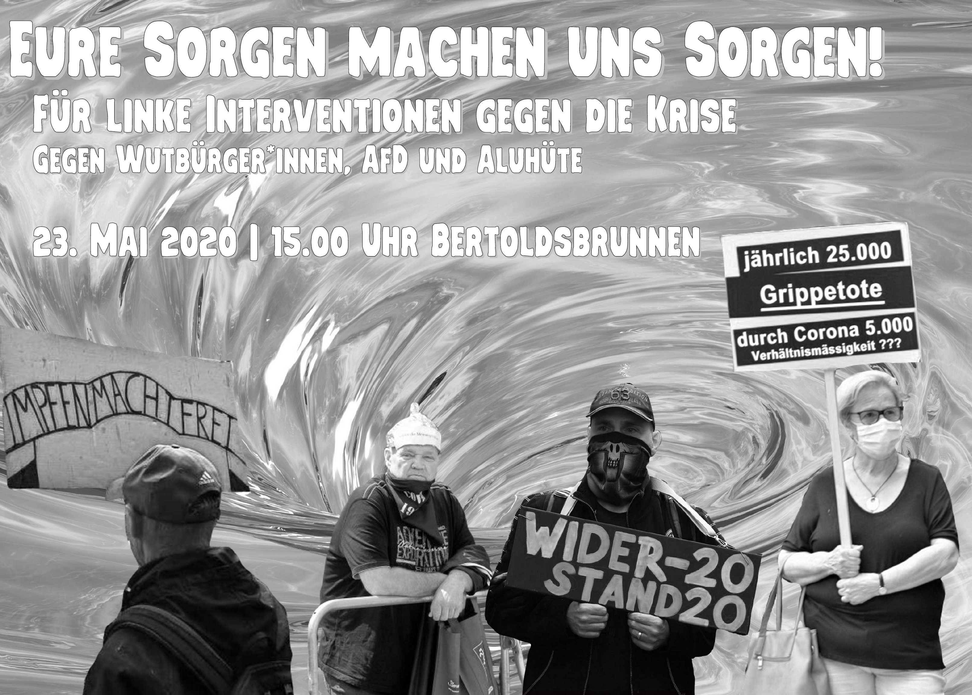 Seit Wochen gehen Corona-LeugnerInnen, ImpfgegnerInnen, Esos, Ökos, Provinz-Rocker und AfD-Nazis auf die Straße und prangern die „totalitäre Willkür-Diktatur“ an, die vermeintlich von der „Bundesregierung und Bill Gates“ ausgeht. Unser Protest richtet sich gegen diese Corona-Querfront. Es ist Zeit für deutliche linksradikale Antworten, denn die sogenannte „Grundrechte-Bewegung“ buhlt nicht zuletzt um die Freiheitsrechte-Thematik, der wir uns mehr denn je zuwenden müssen. Wo bleibt ein Protest der nicht durch Verwirrung und Obskurantismus sondern durch die Benennung der kapitalistischen Systemfehler auftritt?
