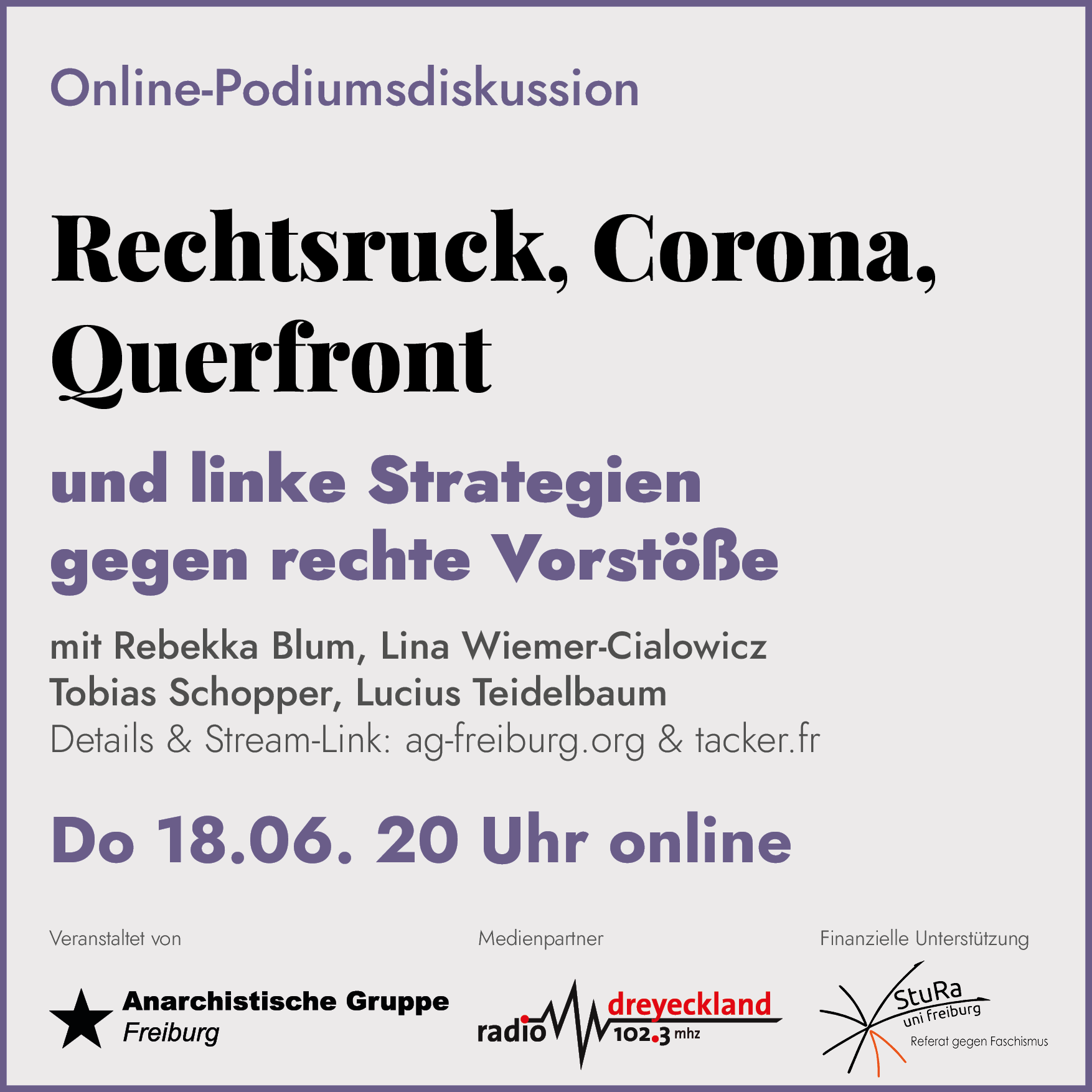 Rechte Strukturen und Akteur*innen versuchen gerade auf vielen Wegen ihren Einfluss auszubauen. Im Internet nimmt faschistische Propaganda und Medienarbeit einen großen Raum ein. Bei Protesten gegen die Restriktionen im Rahmen der Corona-Pandemie stehen nicht nur in Freiburg AfD-Rechtsaußen neben meditierenden Hippies und besorgten Eltern. Angriffe auf die Pressefreiheit und linke Medien nehmen zu, während antifaschistischen Initiativen die Gemeinnützigkeit entzogen wird. Eine drohende Wirtschaftskrise birgt weiteres Radikalisierungspotential. Was passiert hier gerade, und was können wir dagegen tun? Darüber wollen wir mit vier spannenden Gästen diskutieren. Es wird bei dieser Online-Podiumsdiskussion die Möglichkeit geben, mit zu reden und Fragen zu stellen.