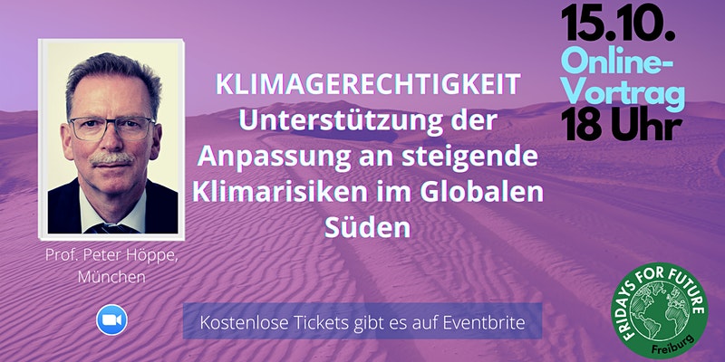 Am 15. Oktober um 18 Uhr haben wir Prof. Peter Höppe zu Gast. Es geht um das Thema “Klimagerechtigkeit - Unterstützung der Anpassung an steigende Klimarisiken im Globalen Süden”. Zunächst geht es dabei um die heute schon sichtbaren Auswirkungen der Klimakrise. Außerdem wird die Frage der Klima-Ungerechtigkeit behandelt (die hauptsächlich Betroffenen haben nahezu nichts zu der heutigen Situation beigetragen). In diesem Zusammenhang geht es auch um Haftungsfragen. Letztlich wird uns Prof. Peter Höppe Lösungsmöglichkeiten aufzeigen, wie z.B. Industriestaaten die ärmeren Länder bei der Anpassung an den Klimawandel unterstützen können. Dabei wird er auch auf Beispiele aus seinem Projekt MCII (Munich Climate Insurance Initiative) eingehen.