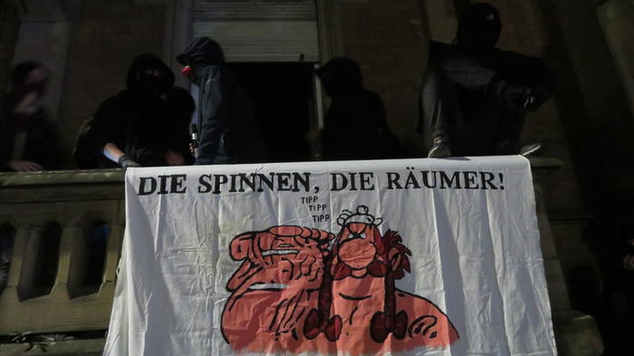 Wir laden daher zur Prozessbegleitung in Form einer Kundgebung ein, um unsere Solidarität mit dem angeklagten Besetzer auszudrücken. Kommt vermummt und haltet den 1,5m-Abstand ein! Lasst uns gemeinsam dem staatlichen Angriff entgegentreten.