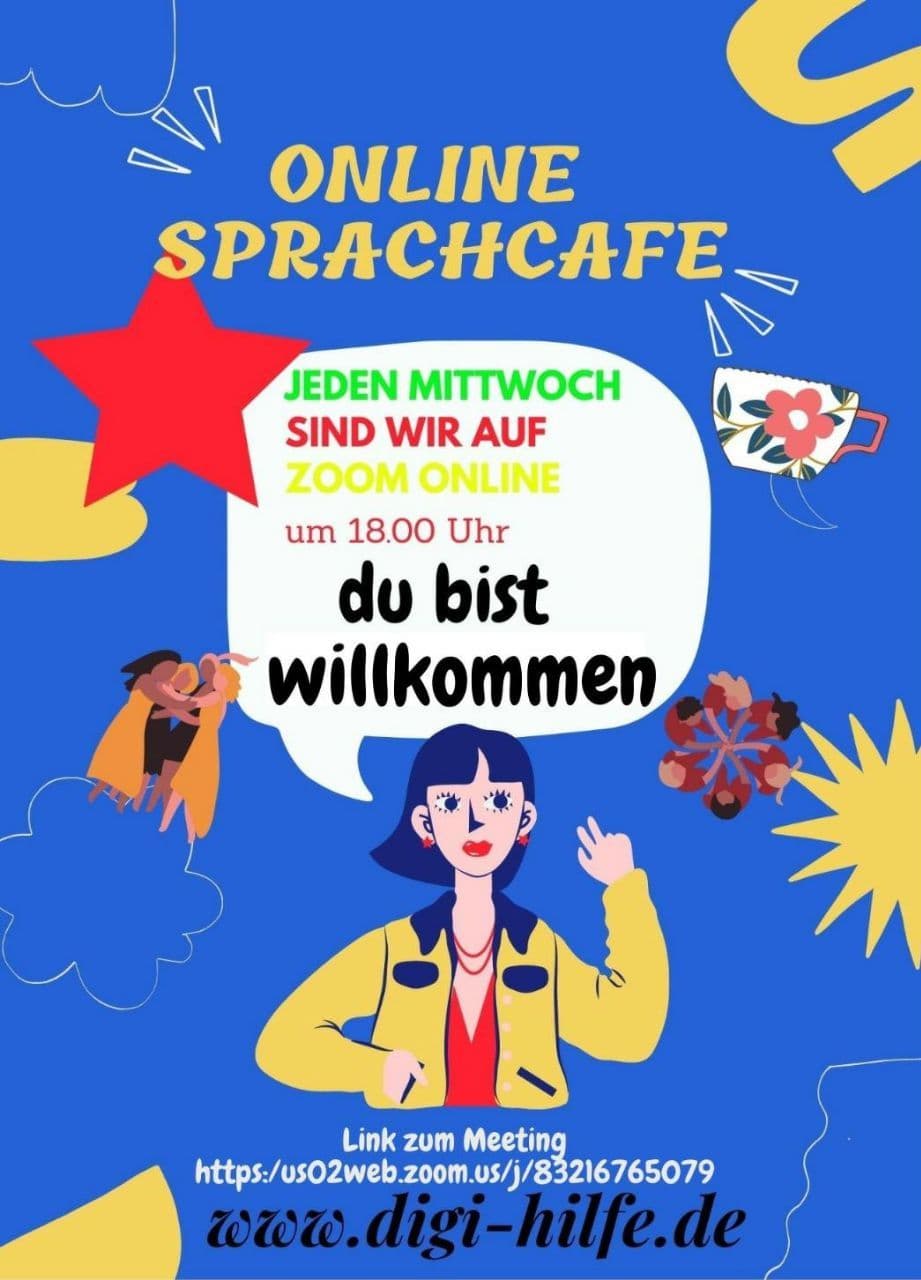 Jeden Mittwoch und Mittwoch um 18:00 Uhr Mittwoch, 24.12.25 um 18:00 Uhr - 20:00 Mittwoch, 31.12.25 um 18:00 Uhr - 20:00 online Sprachcafé Deutsch: Damit wir auch ohne Deutschkurs unser Deutsch nicht vergessen, treffen wir uns , um miteinander zu reden und Übungen zusammen zu machen. Teilnehmen: https://us02web.zoom.us/j/83216765079 Links https://www.digi-hilfe.de/webinare Type of Event Inhaltliche Veranstaltung Support & DIY Workshop