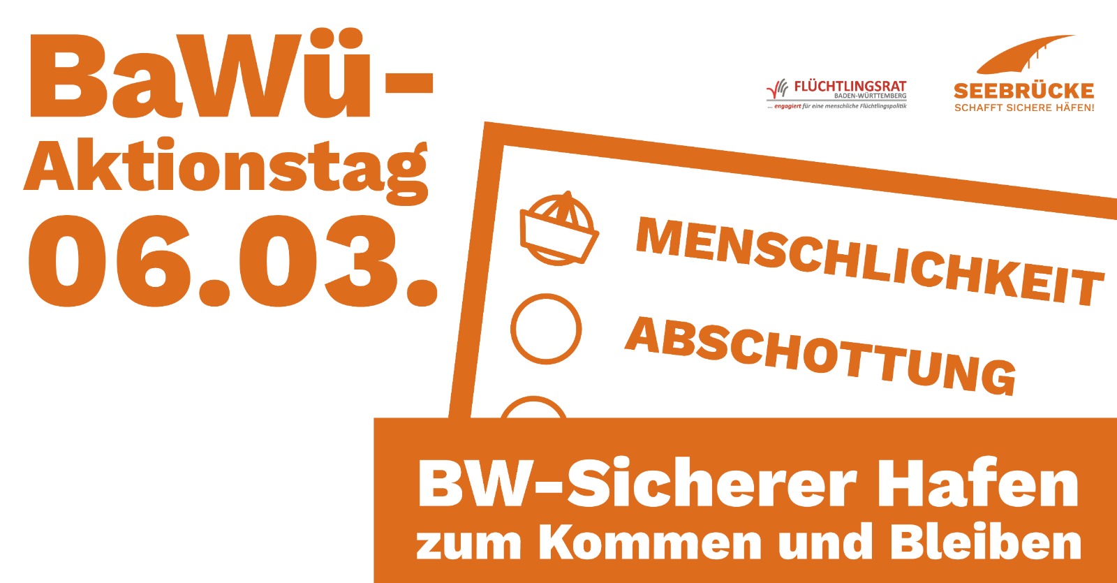 Am 14. März stehen die Landtagswahlen in Baden-Württemberg an und gemeinsam mit den anderen baden-württembergischen Seebrücken, dem Flüchtlingsrat und über 170 weiteren Initiativen, die unsere Kampagne “Sicherer Hafen Baden-Württemberg” unterstützen, wollen wir am Wochenende (6.-7. März) vor den Wahlen noch einmal richtig laut werden und zeigen, dass die Wahrung der Menschenrechte ein wichtiges Thema für diese Wahlen ist. #MenschlichkeitWählen #AbschottungAbwählen
