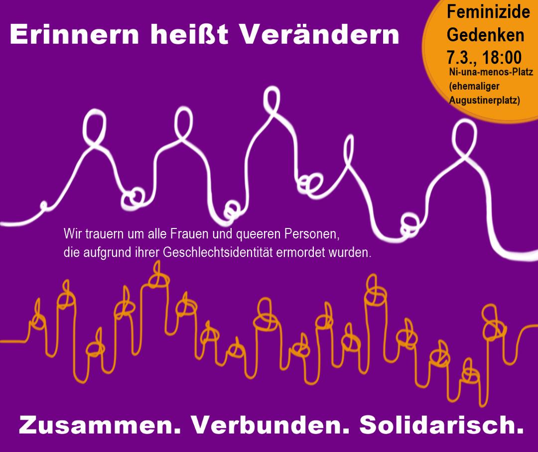 Wir wollen am 7.3.2021 um 18 Uhr, am Vorabend des Internationalen Frauen*kampftages, zusammenkommen, um allen ermordeten Frauen und queeren Personen zu gedenken. Treffpunkt ist am Ni-Una-Menos Platz (ehem. Augustinerplatz).