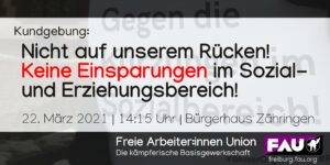 Wir rufen zu einer Kundgebung am 22. März um 14.15 Uhr vor dem Bürgerhaus in Zähringen auf. Dort tagt um 15.00 Uhr der Haupt- und Finanzausschuss. Wir wollen die Gemeinderäte mit unserer Kritik konfrontieren und unser Anliegen in die Öffentlichkeit tragen. Achtet auf das Tragen einer medizinischen/FFP2 Maske sowie genügend Abstand!