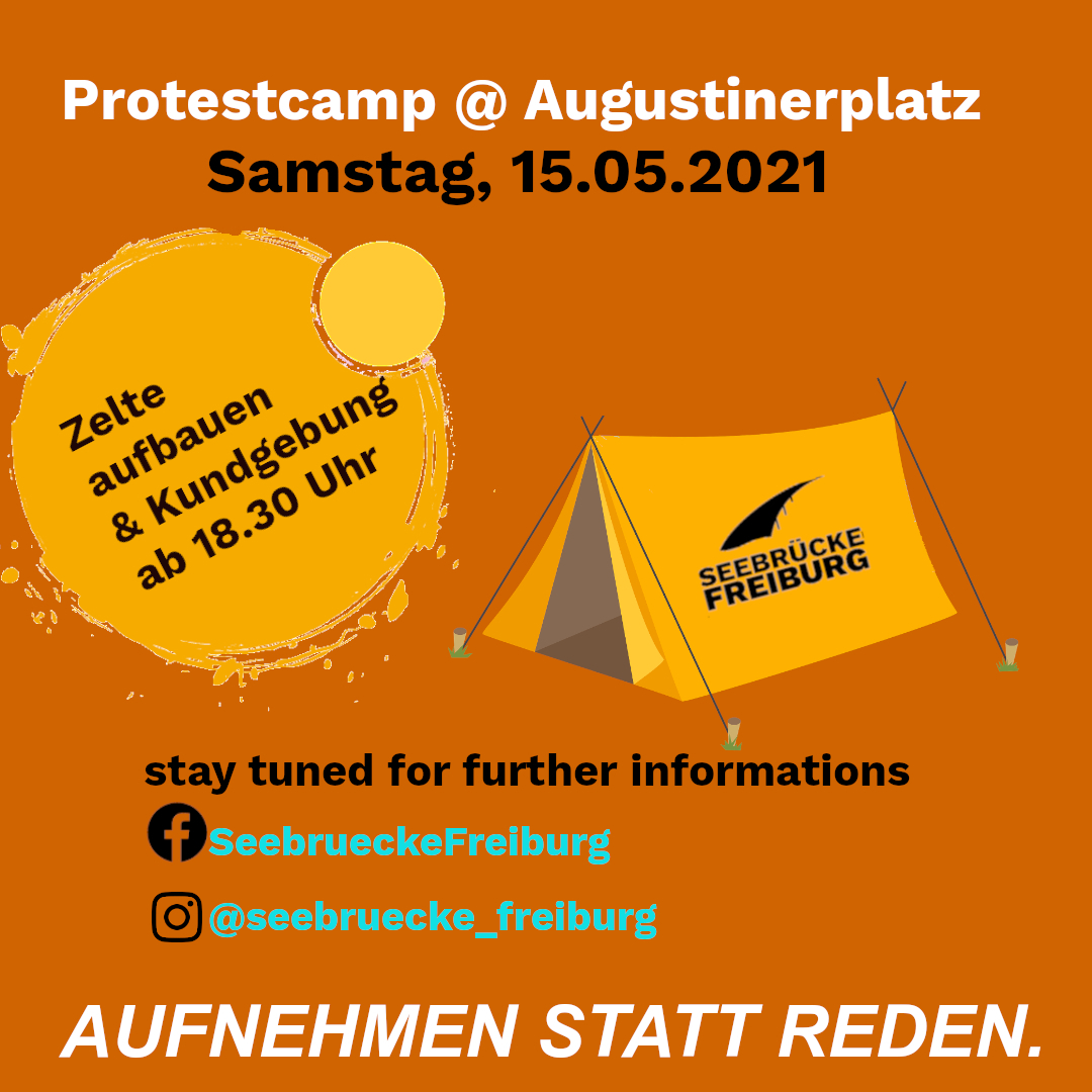 Am kommenden Samstag, den 15.05., steht unser nächstes Protestcamp an. Um 18.30 Uhr geht es los am Augustinerplatz. Im Rahmen des BW-Aktionstags "Aufnehmen statt Reden", fordern wir die sofortige Umsetzung des Landesaufnahmeprogramms aus dem neuen Koalitionsvertrag und kritisieren das Bekenntnis der Landesregierung zur LEA, sowie die Abschiebehaft!