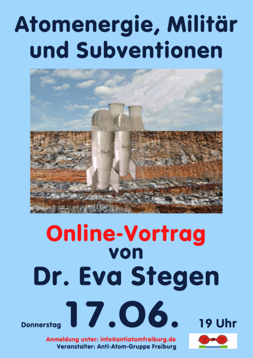 Die Anti-Atom-Gruppe Freiburg bietet eine Online-Veranstaltung zum Thema 'Atomenergie, Militär und Subventionen' mit Dr. Eva Stegen an. Anhand öffentlich zugänglicher Informationen deckt sie auf, welche Interessen nach wie vor gigantische finanzielle Mittel für den Neubau von Atomkraftwerken mobilisieren.