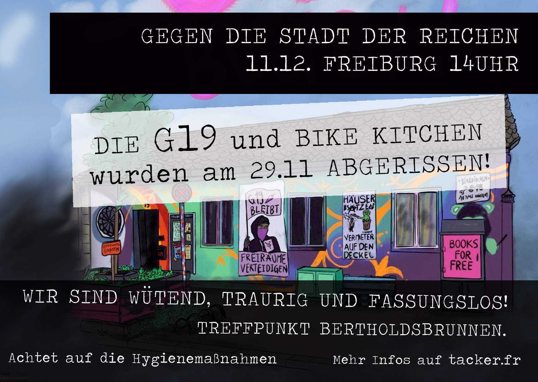 Am Montag des 29. Novembers wurden ohne jede Vorwarnung und unerwartet die G19 und BikeKitchen von Cops abgesperrt und im Anschluss ausgeräumt und abgerissen. Innerhalb weniger Stunden wurde die Häuser platt gemacht. Eine Gruppe an Menschen versammelte sich um Zeug*innen des unerwarteten Abrisses zu sein. Die Szene war geprägt von Trauer, wütenden Blicken und Fassungslosigkeit. Die G19 und die BikeKitchen waren als nichtkommerzielle und hierachiefreie Orte wichtige Bestandteile der autonomen Kultur in Freiburg. Hier konnten Utopien kreiert und ausgelebt und sich der neoliberalen Gesellschaft entzogen werden. Diese Gesellschaft hat erneut bewiesen, dass Freiräume nicht erwünscht sind und uns einen solchen geklaut. Das ist kein neues Phänomen. Überall werden gerade Freiräume und linke Projekte angegriffen und geräumt, wie zuletzt der Köpi Wagenplatz in Berlin. Es gibt immer weniger Möglichkeiten autonome Politik auszuleben. Aber diese Verdrängungswut trifft nicht nur autonome Hausprojekte und besetzte Kulturzentren. Jede Form anderen Zusammenlebens, alles was keinen Profit abwirft, wird von Spekulant*innen und ihren Handlangern von der Karte gewischt. Erst werden unsere Häuser geräumt, unsere Räume verdrängt und dann können auch wir nicht mehr in unsern Vierteln leben.