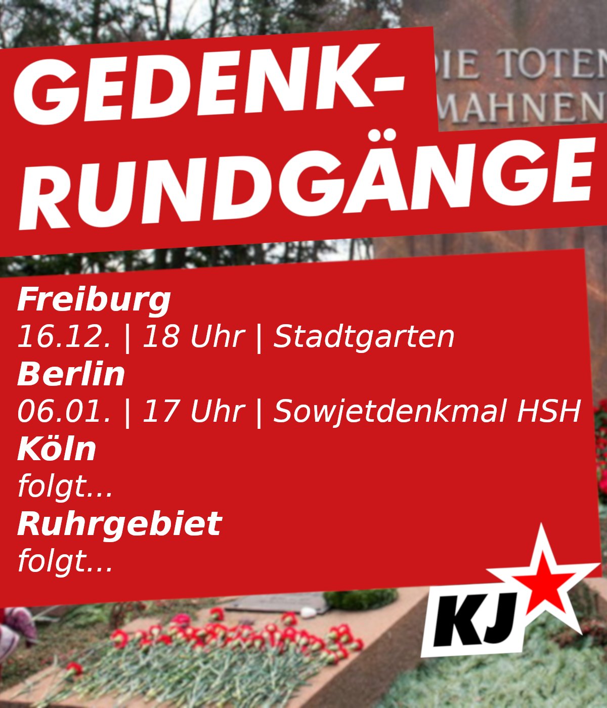 Zusätzlich zum Zentralen Gedenken an Rosa Luxemburg, Karl Liebknecht und Wladimir Lenin bei der LLL Demonstration in Berlin plant die Kommunistische Jugend im Dezember und Januar in verschiedenen Städten Gedenkrundgänge. Mit diesen soll das Andenken an Menschen, die als Kommunist:innen oder Widerständige in ihren Kampf für eine befreite Gesellschaft oder gegen den Faschismus schwere Repressionen und zum Teil sogar den Tod in Kauf genommen haben, lebendig erhalten werden.