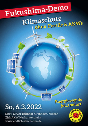 Anläßlich des Jahrestages der Katastrophe von Fukushima planen wir eine *Busfahrt zur Demo am AKW Neckarwestheim*.
