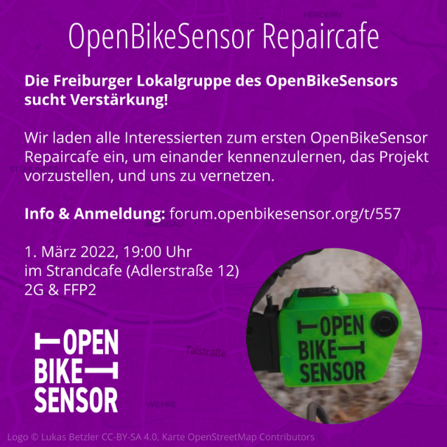 Wir möchten euch herzlich einladen zum ersten OpenBikeSensor Repair-Café am Dienstag, 1. März 2022 19:00 Uhr im Strandcafé auf dem Grether-Gelände (Adlerstraße 12). Dort wollen wir:
