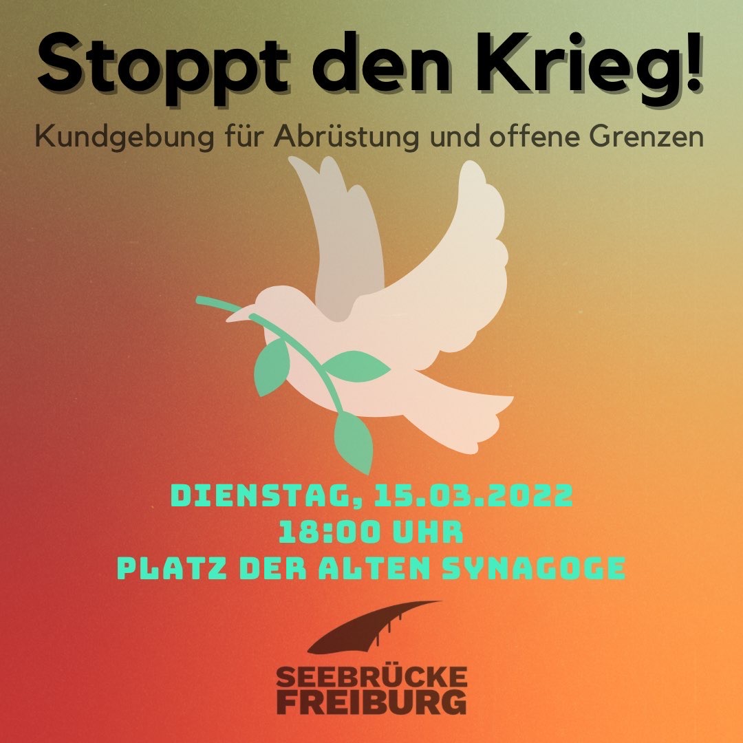 Deshalb wollen wir am Dienstag, dem 15.03.2022, um 18:00 auf dem Platz der Alten Synagoge mit euch auf die Straße gehen. Gegen diesen Krieg. Gegen jeden Krieg!