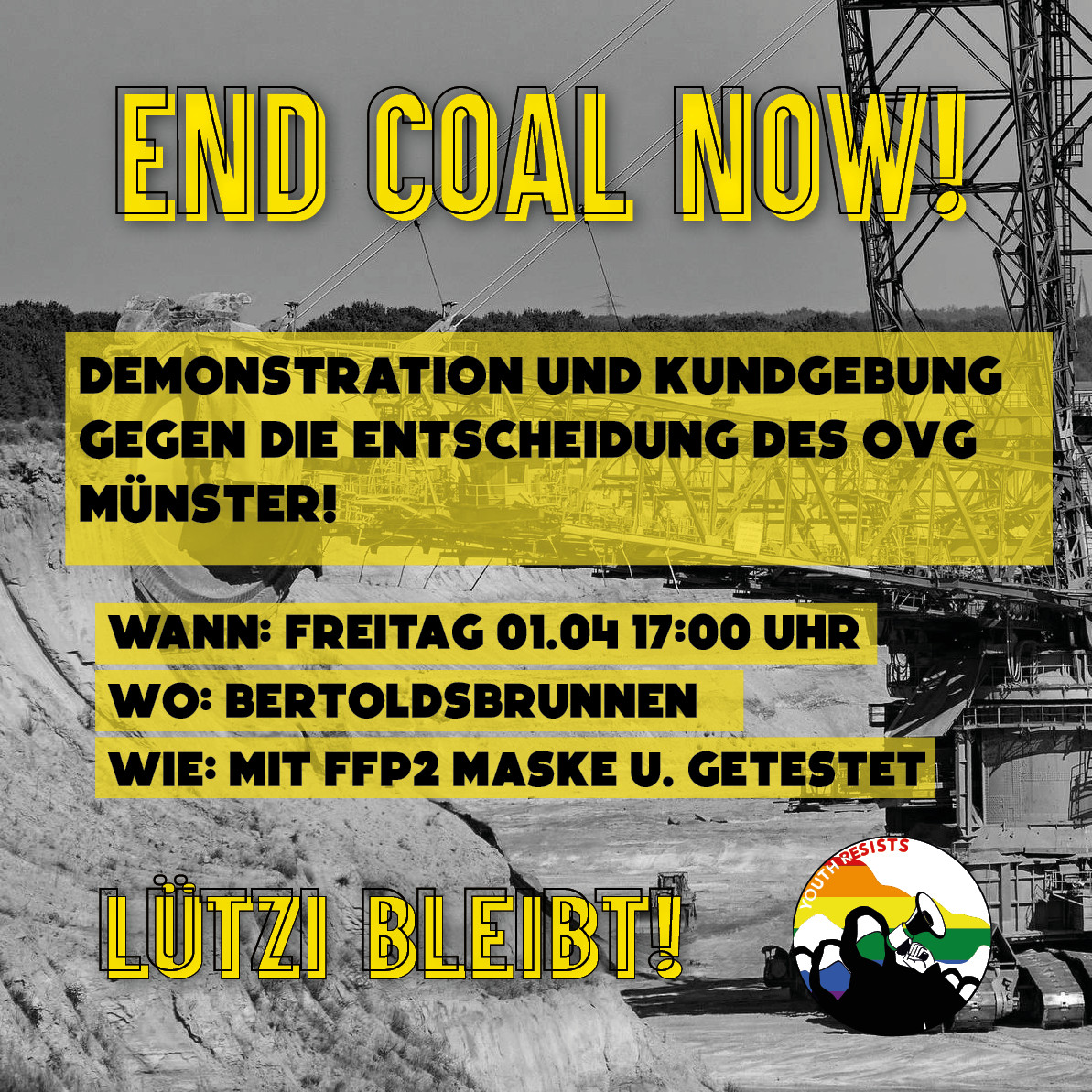 Diese Woche am Montag den 28.03 hat das OVG Münster entschieden, dass Lützerath in NRW geräumt werden darf, um die darunterliegende Kohle abzubaggern. Mit diesem Urteil wurde einmal mehr bewiesen, dass für die Verantwortlichen in den Machtpositionen die Profitinteressen einer aussterbenden Industrie über den vielen Menschenleben stehen, die aufgrund des Klimawandels leiden und das in Zukunft noch mehr werden. Um unsere Solidarität mit den vertriebenen Dorfbewohner*innen und den Beschützer*innen des Dorfes zu zeigen und unsere Wut über die unverantwortliche Ignoranz der Entscheidungsträger*innen zu zeigen wird am Freitag um 17 Uhr am Bertoldsbrunnen eine Kundgebung mit anschließendem Demozug stattfinden. Nehmt eure Freund*innen mit, zieht warme Sachen an und kommt zahlreich (am besten getestet).