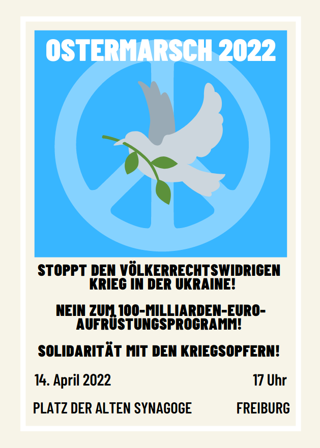 gegen Waffen und Gewalt nicht nur in der Ukraine, auch allen anderen Kriegsschauplätzen für die Unterzeichnung des AVV von Seiten unserer Bundesregierung um für unseren Ostermarsch, der am Gründonnerstag, 14.4. ab 17h stattfindet, zu informieren