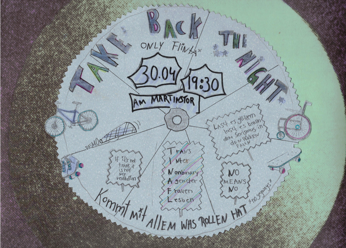 TAKE BACK THE NIGHT! Dieser Aufruf geht an alle FrauenLesbenInterNichtbinärTransAgender*(FLINTA*). Die"Take back the Night" Demos wollen auf sexistische, sexualisierte und patriarchale Gewalt aufmerksam machen und stehen für Selbstbestimmung am Tag und in der Nacht! Nicht alle werden auf die gleiche Weise bedroht, dabei ist Rassismus, Trans*feindlichkeit und Misogynie mit anderen patriarchalen Strukturen verschränkt. Heute Nacht wollen wir uns stark fühlen!