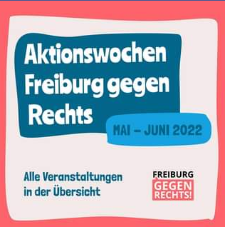 Aktionswochen Freiburg gegen Rechts Mit einem Aktionsmonat, der am Tag der Befreiung vom Faschismus beginnt, wollen wir unsere verschiedenen Akteur:innen vorstellen, die Freiburger Zivilgesellschaft zusammenbringen und eine gesellschaftliche Debatte über den Rechtsruck anregen. Sonntag, 08.05.22 um 18:00 Uhr - Samstag, 04.06.22 um 19:00 Uhr Mai08 Singen bis es keine Nazis mehr gibt - Kultur wider das Vergessen Konzert, Kabarett, Lesungen zum Tag der Befreiung am 8.Mai 1945 mit Freiburger und überregionalen Künstlern 18:30 Alemannische Bühne Freiburg Gerberau 15 Freiburg 79098 Deutschland Mai14 Stadtrundgang: Widerstand gegen das Naziregime Wer stellte sich dem NS-Regime schon früh entgegen? Wie organisierten sich die illegalen Arbeiter:innen-Parteien? Welche Bedeutung hatte unsere Stadt bei der Weiterverbreitung antifaschistischer Schriften? Mit Rüdiger Binkle 15:00 Amtsgericht Freiburg Holzmarkt 2 Freiburg 79098 Deutschland Mai19 Die Strategie der Rechten um Einfluss in den Betrieben zu gewinnen Vortrag mit Lukas Wetzel 19:00 Gewerkschaftshaus Freiburg Friedrichstraße 41-43 Freiburg im Breisgau 79098 Deutschland Mai20 Gemeinsam Druck machen! Offene Siebdruckwerkstatt: Setzt mit euren neu bedruckten Textilien ein Zeichen gegen Rechts! Bringt gerne Stoffe, T-shirts, etc. zum Bedrucken mit. 18:00 Haus des Engagements Rehlingstraße 9 Freiburg im Breisgau 79100 Deutschland Mai21 Europas Nazis in der Kampfsportszene 19:00 Luftschloss Arne-Torgersen-Straße 24 Freiburg im Breisgau 79115 Deutschland Mai26 Banner-Aktion Gemeinsames Gestalten von Bannern gegen Rechts und für den Frieden in der Ukraine mit anschließendem Fotoshooting der Banner vor der Blauen Brücke. 14:00 Terasse der IG-Metall Mai28 Kicken gegen Rechts 12:00 Freisportanlage Staudinger Gesamtschule Mai29 Demokratieabbau mit Hilfe von rechten Bewegungen Rechte werden oft benutzt als Rechtfertigung für verschiedene antidemokratische Gesetze, wie Versammlungsgesetze oder Berufsverbote, die nach deren Inkrafttreten meistens nur linke und progressive Kräfte treffen. 14:00 Linkes Zentrum Freiburg (LiZ) glümerstraße 2 Freiburg 79102 Deutschland Juni03 Kunstausstellung: Vom Rand zum Zentrum Wir bieten Raum für Menschen mit Rassismus-, Ausgerenzungs- und Antidiskriminierungserfahrung sich kreativ, künstlerisch und intellektuell damit auseinander zu setzen. Die Kunstausstellung in sensibler und sicherer Umgebung gibt denen Aufmerksamkeit, die 00:00 Den ganzen Tag an verschiedenen Orten in der Stadt