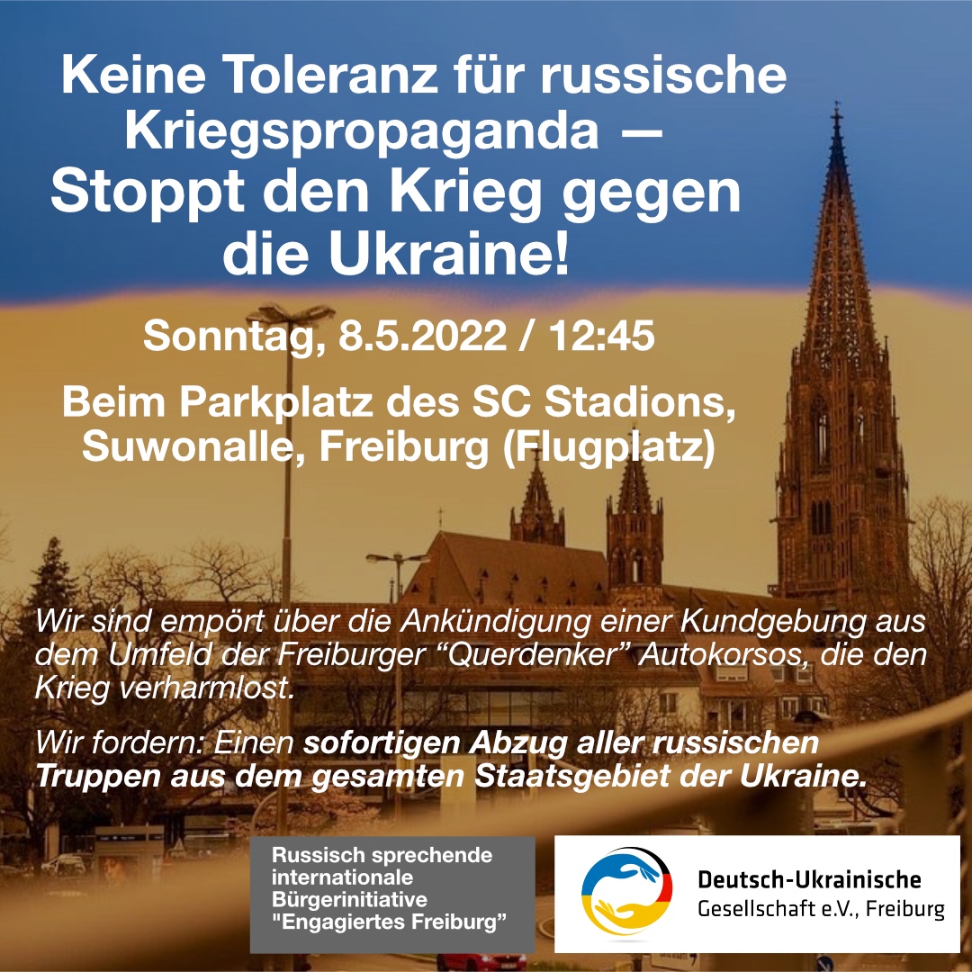Deutsch-Ukrainische Gesellschaft Freiburg e.V. laden Sie gemeinsam ein zur Demonstration gegen den pro-russischen Autokorso, der am 8.5.22 in Freiburg stattfindet!