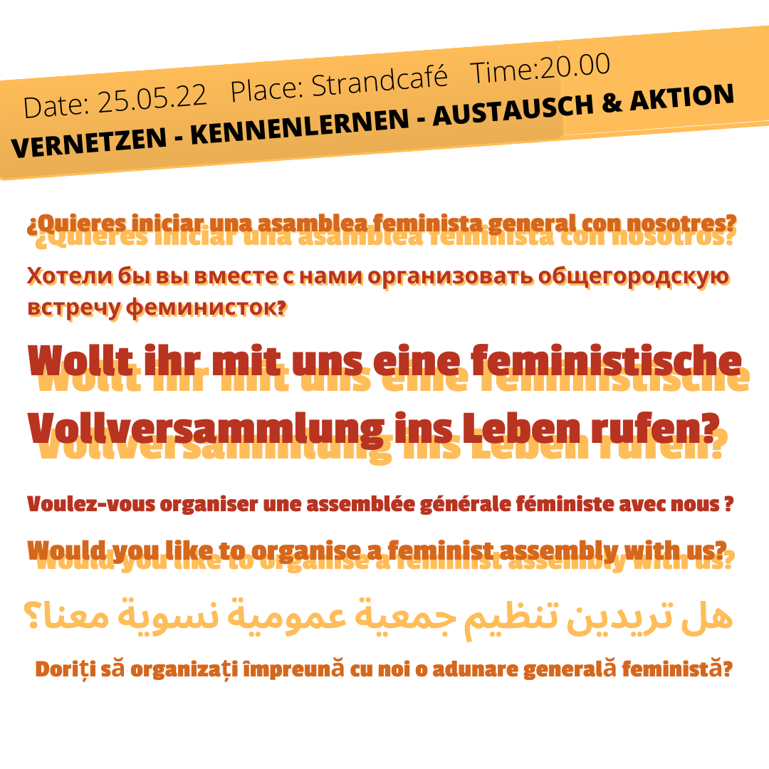 Wollt ihr mit uns eine feministische Vollversammlung ins Leben rufen? Diese Einladung kommt aus der 8. März demo-Vernetzung von diesem Jahr. Es ist ein Versuch, feministische Bündnisarbeit in Freiburg zu stärken und nicht nur auf den 8. März zu fokussieren. So soll auch ein gemeinsames handeln und reagieren auf aktuelle politische Geschehnisse, aber auch inhaltliche Diskussion & lernen möglich werden. Es werden noch Menschen für flüster-übersetzungen in verschiedene Sprachen gesucht. Offen mit FLINTA* (Frauen_Lesben_trans_inter_agender) Bitte Maske mitbringen und vorher gerne testen.