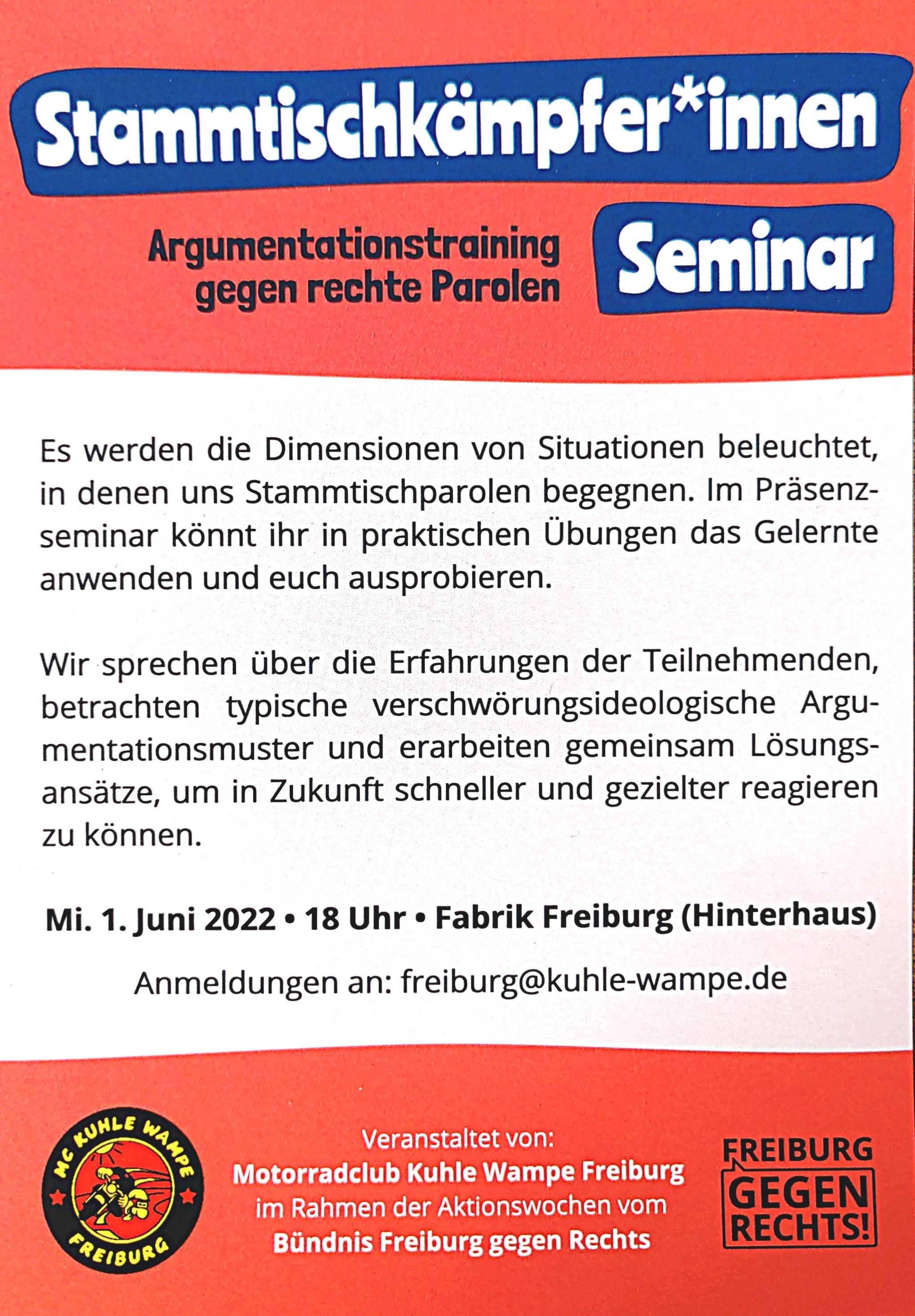 im Rahmen des Aktionsmonats "Freiburg gegen Rechts" veranstaltet der MC Kuhle Wampe Freiburg ein Stammtischkämpfer*innen Seminar am Mittwoch 01.06.2022 um 18:00 Uhr in der Fabrik Freiburg. Du / Ihr seid dazu herzlich eingeladen.