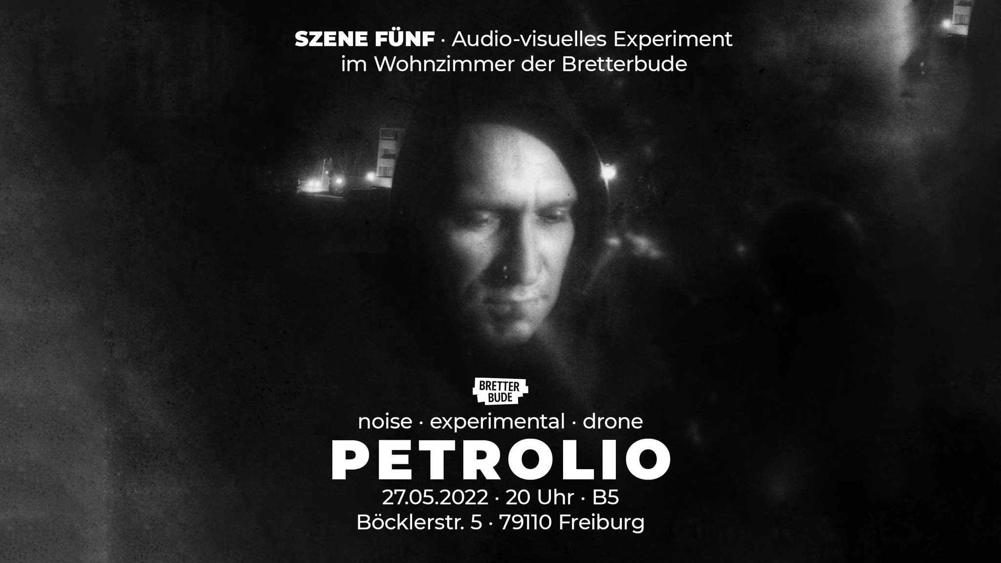 Szene Fünf ist ein audio-visuelles Experiment im Wohnzimmer der Bretterbude. Am 27.05.2022 ist Petrolio bei uns zu Gast. Im Gepäck: Noise, Experimental & Drone.