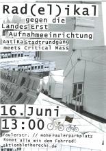 Rad(el)ikal gegen die LandesErstAufnahmeeinrichtung Samstag, 16.06.18 um 13:00 Uhr AntiRa Stadtrundgang meets Critical Mass Treffpunkt: Faulerstr. Höhe Faulerparkplatz