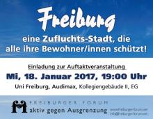 Freiburg: eine Zufluchts-Stadt, die alle ihre Bewohner/innen schützt! Mittwoch, 18.01.17 um 19:00 Uhr Einladung zur Auftaktveranstaltung Audimax Uni Freiburg