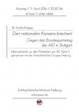 18. Antifa-Kneipe: Den nationalen Konsens brechen! Montag, 11.04.16 um 20:30 Uhr Informationen zu den Protesten am 30. April in Stuttgart// gemeinsam mit der Anarchistischen Gruppe Freiburg