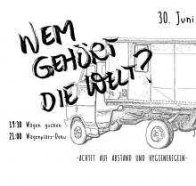 Das Wagenkollektiv Radlager öffnet am 7.7 um 1930 ein paar ihrer fahrbaren Zuhause, lädt zum Rumhängen ein (bitte beachtet die üblichen Hygiene Regeln) und zeigt um 2100 eine richtig knorke Doku über den Wagenplatz „Wem gehört die Welt?“.